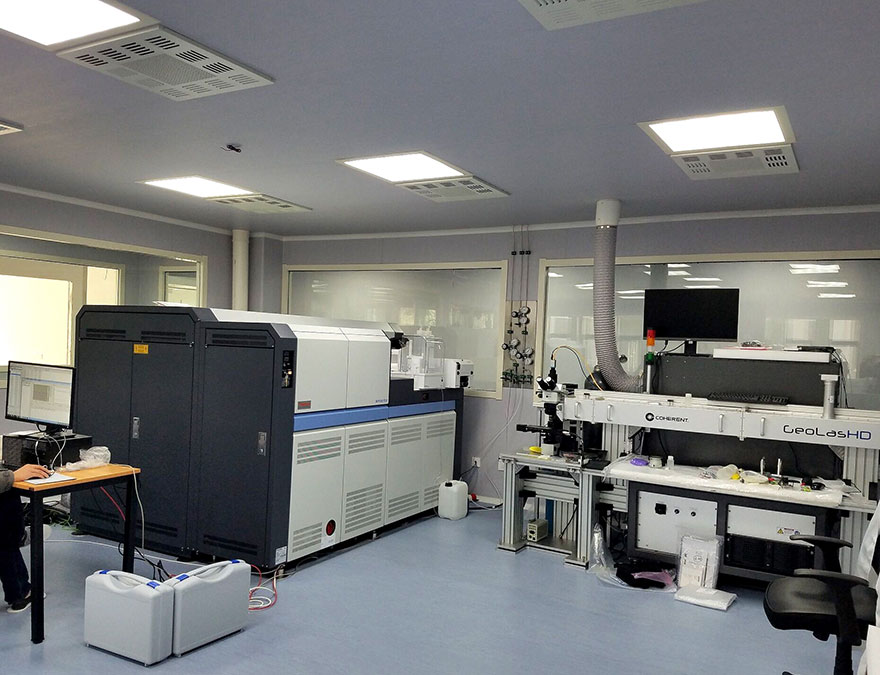 GeoLas系列是地质微区分析领域应用最为广泛的激光剥蚀系统。该仪器采用Ar-F气态准分子激光器。准分子激光器结构简单、操作方便、工作介质均匀,能长时间较稳定地连续工作。配置奥林巴斯专业显微镜,能够观察岩石薄片。激光波长193 nm,可被大多数天然矿物吸收,已经在基体不匹配外标校正的应用中取得成功,被认为是一种分析地质样品主微量元素的理想技术。