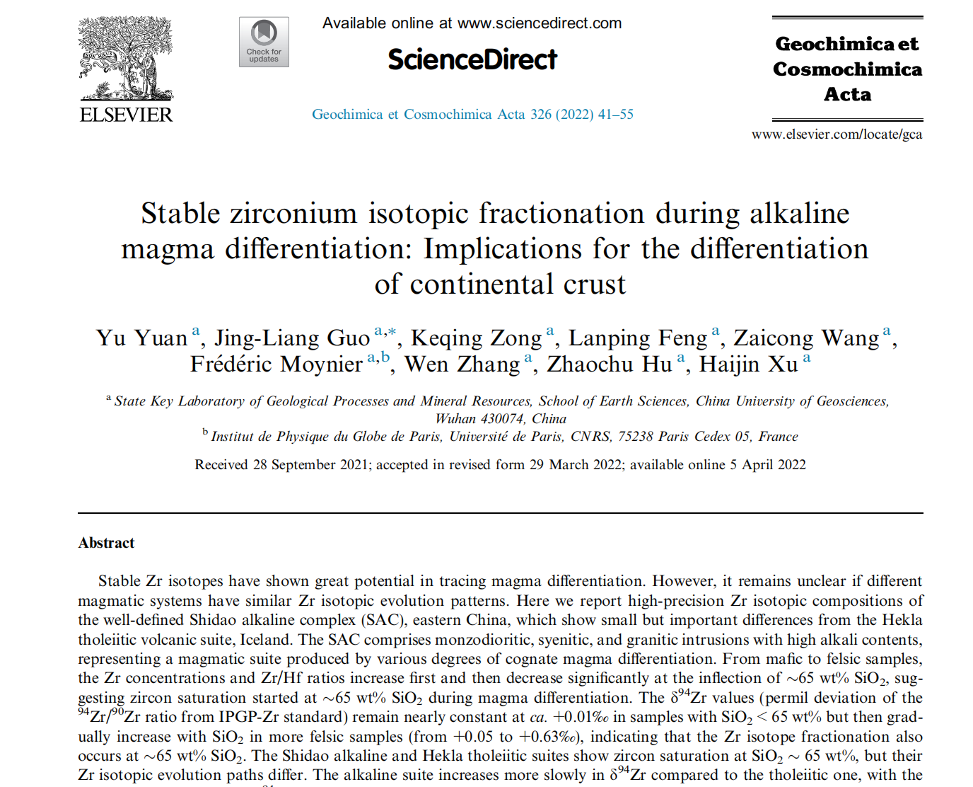 Yu Yuan, Jing-Liang Guo , Keqing Zong, Lanping Feng, Zaicong Wang, Fre´de´ric Moynier, Wen Zhang , Zhaochu Hu, Haijin Xu, 2022. Stable zirconium isotopic fractionation during alkaline magma differentiation: Implications for the differentiation of continental crust. Geochimica et Cosmochimica Acta.