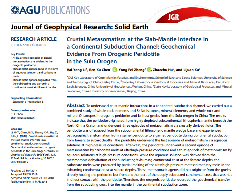 2018. Crustal Metasomatism at the Slab-Mantle Interface in a Continental Subduction Channel: Geochemical Evidence From Orogenic Peridotite in the Sulu Orogen. Journal of Geophysical Research: Solid Earth.